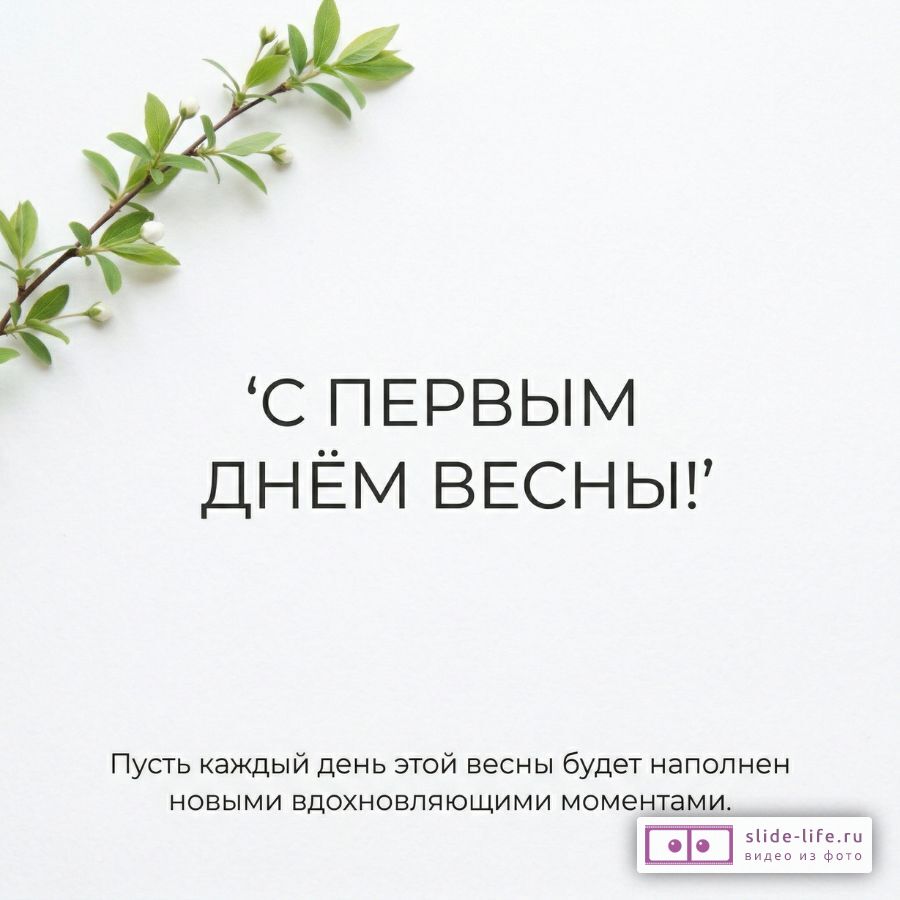 Скачайте бесплатную готовую открытку «Открытка с первым днём весны — пожелания любви, вдохновения и новых начинаний» прямо сейчас и отправьте ее на WhatsApp или другой мессенджер.