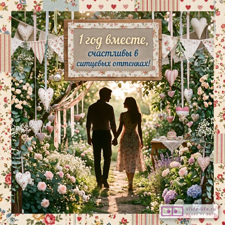 Скачайте бесплатную готовую открытку «Поздравление с 1-й годовщиной свадьбы — Открытка с ситцевыми мотивами» прямо сейчас и отправьте ее на WhatsApp или другой мессенджер.
