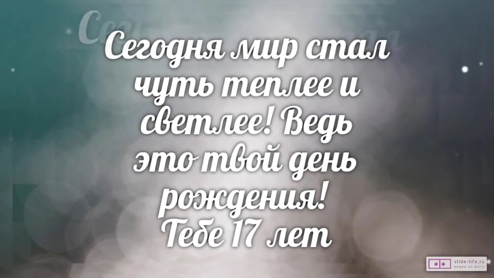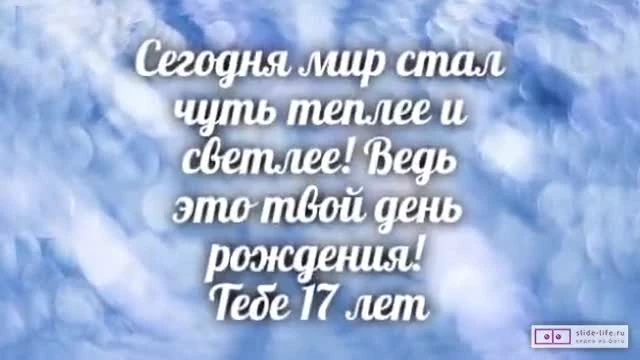 Скачайте бесплатное готовое видео «Слайд-шоу с днем рождения девушке 17 лет» прямо сейчас и отправьте его на WhatsApp или любой другой мессенджер.
