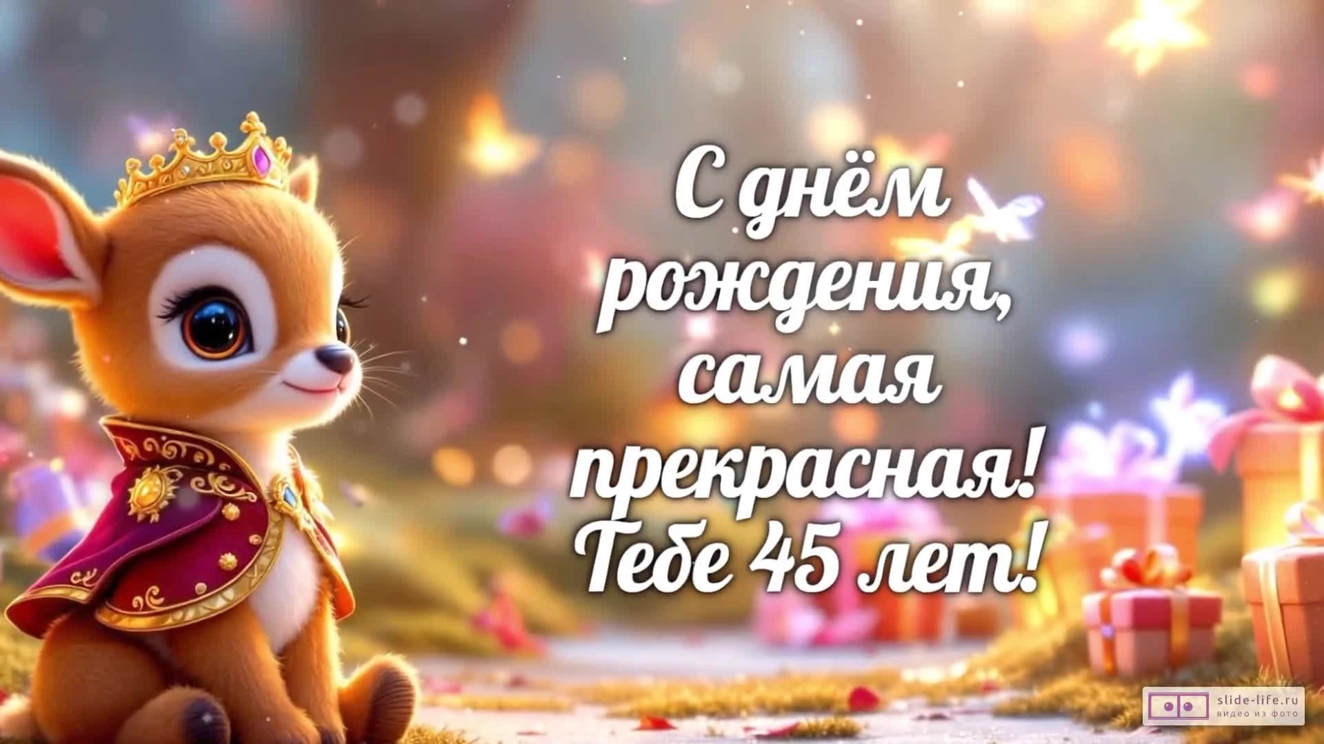 Скачайте бесплатное готовое видео «Современное видео поздравление с днем рождения женщине 45 лет» прямо сейчас и отправьте его на WhatsApp или любой другой мессенджер.