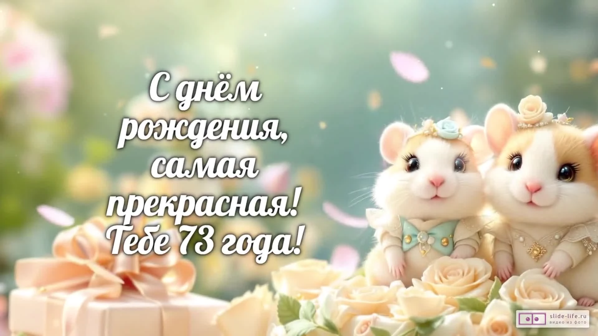 Скачайте бесплатное готовое видео «Современное видео поздравление с днем рождения женщине 73 года» прямо сейчас и отправьте его на WhatsApp или любой другой мессенджер.